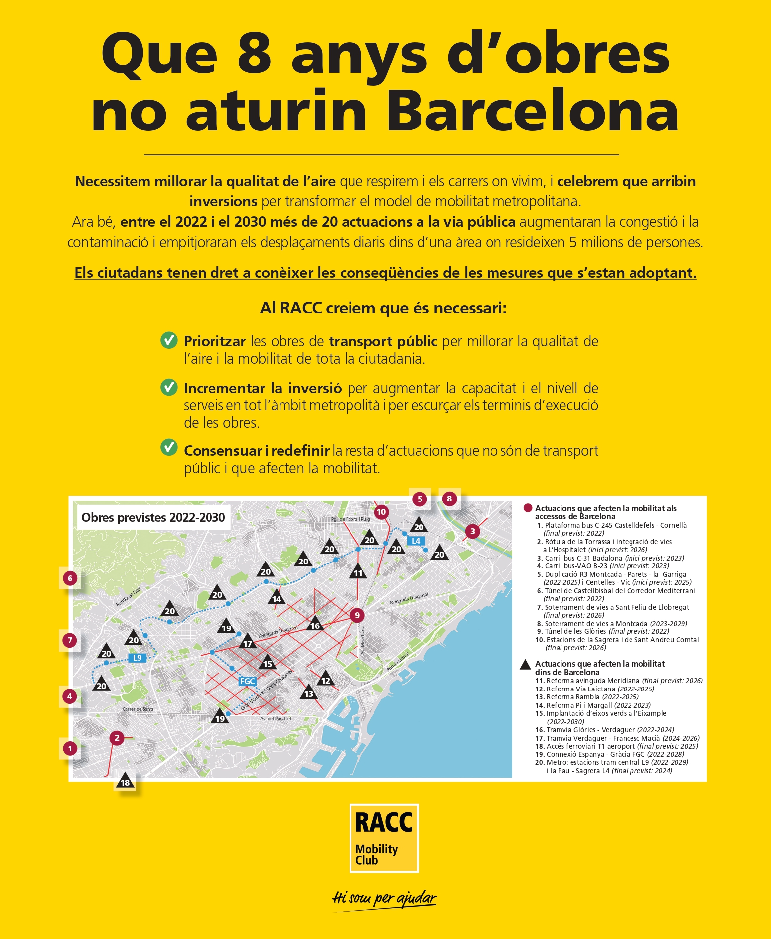 El RACC ha publicat una nota a diversos diaris en la qual demana que els ciutadans de Barcelona rebin informació clara sobre les conseqüències de les obres que es realitzaran els propers anys a la ciutat. El text també assenyala les prioritats d’inversió identificades pel Club.